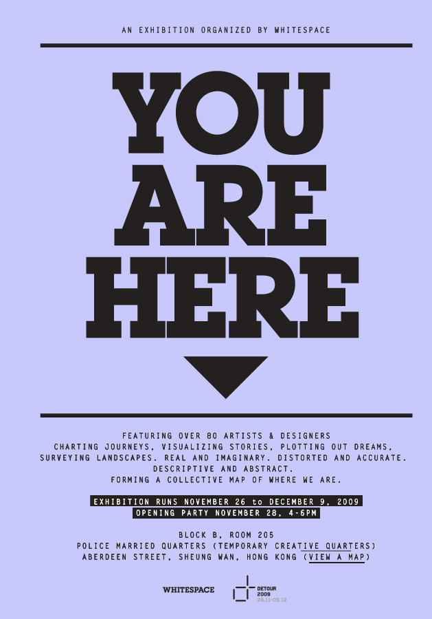 ‘YOU ARE HERE’ is an exhibition organized by local design studio, WHITESPACE as part of DETOUR 2009, an outbound programme parallel to Business of Design Week (BODW). The exhibition will launch on Thursday 26th November, 2009 and run until December 9th 2009 at the Former Police Married Living Quarters on Hollywood Road