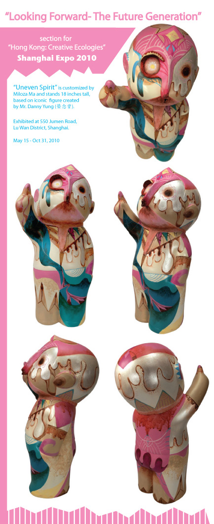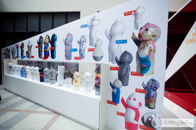 除了獨當一面的設計大師之外,場地還展示香港創意新一代的力量,透過50位年青設計師在榮念曾設計的意喻「天天向上」的公仔上,發揮他們的創意。